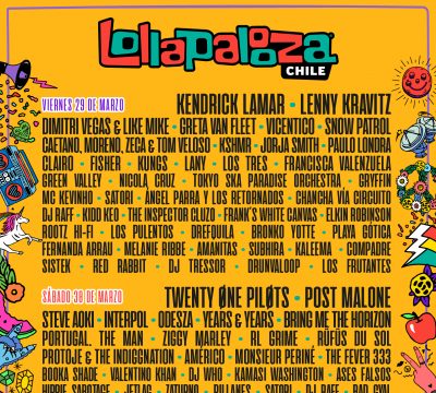 LA VITRINA MULTICOLOR DE LOS ARTISTAS LOCALES. 1 day agoLollapalooza Chile ya tiene fecha definitiva para celebrar sus 10 años. Considerado um dos maiores festivais de música do Mundo e que ocorre anualmente no Brasil EUA México Argentina e Chile mas que devido a pandemia teve a sua edição de 2020 cancelada o Lolla soltou as datas para a sua próxima edição.